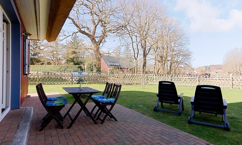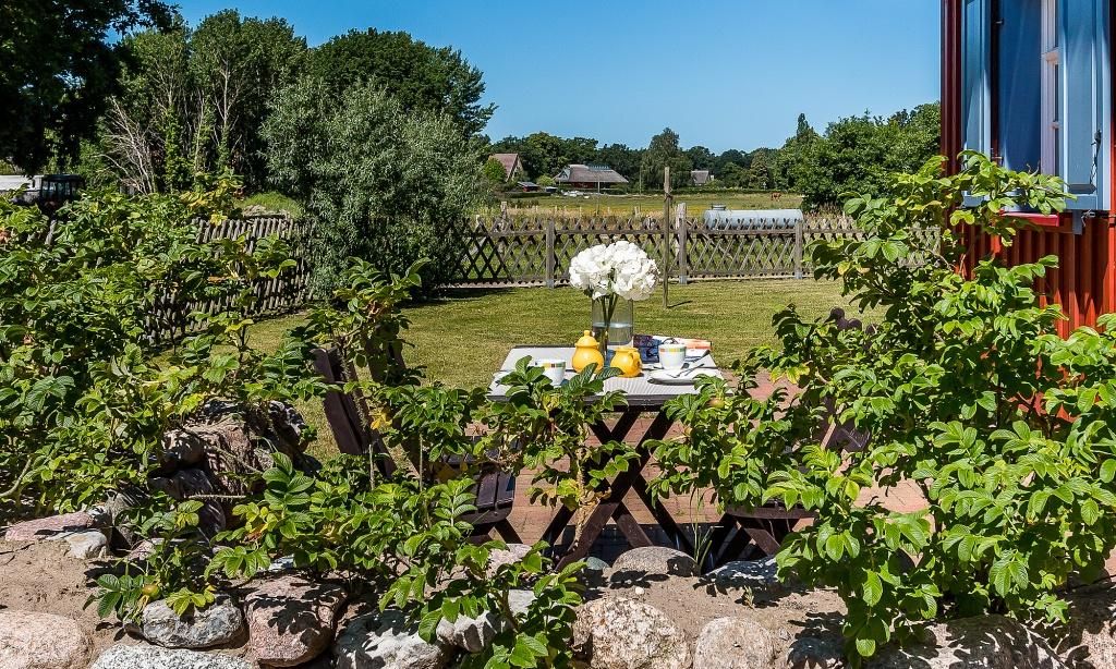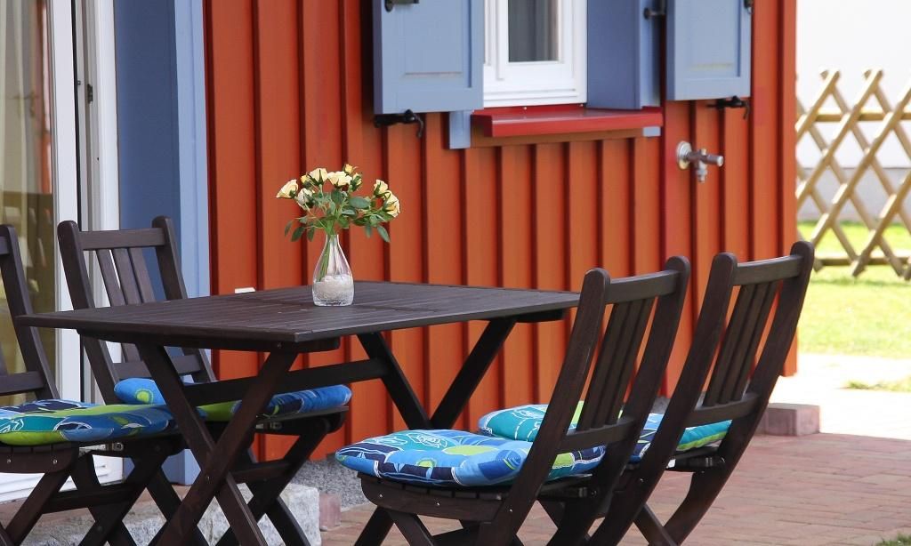 Der Außenbereich begeistert durch sein eingezäuntes Grundstück. Hier kannst du es dir auf der Steinterrasse mit Mobiliar gemütlich machen und mit Blick ins Grüne, die Seele baumeln lassen. Neben einem abschließbaren Fahrradplatz gehören auch zwei PKW-Stellplätze zum Ferienhaus.