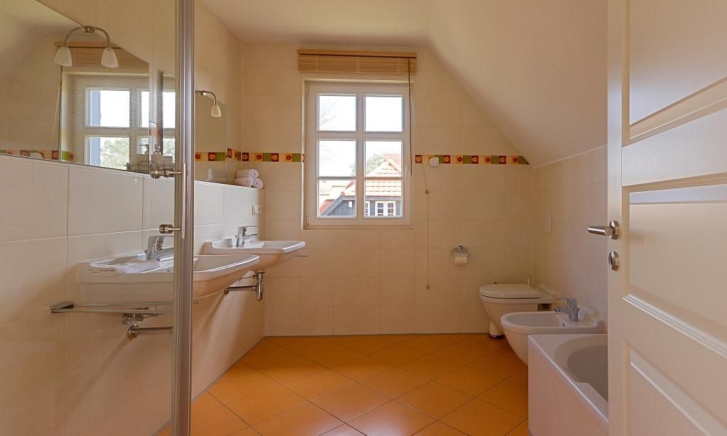 Das Erdgeschoss verfügt über einen großzügigen Wohnraum mit Kaminofen und einer gemütlichen Sitzecke. Die komfortable Einbauküche und der große Esstisch sorgen für einen offenen Wohncharakter und versprechen Ihnen gesellige Abende mit der ganzen Familie. Das Bad mit Dusche/WC und Waschmaschine schließt sich direkt an. Weiterhin findet ein kleiner Flur sowie ein Abstellraum in der unteren Etage Platz. Im Obergeschoss befinden sich drei Schlafzimmer, die mit je einem Doppelbett ausgestattet sind. Das großzügige Hauptbadezimmer mit Doppelwaschbecken, Badewanne, Dusche, WC und Bidet rundet den Wohnkomfort ab.