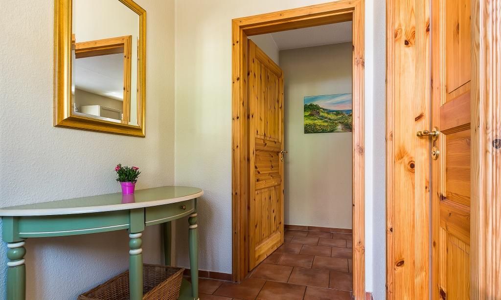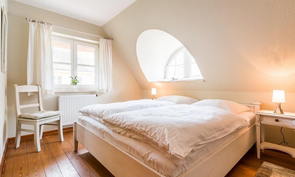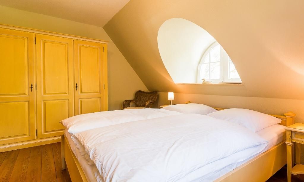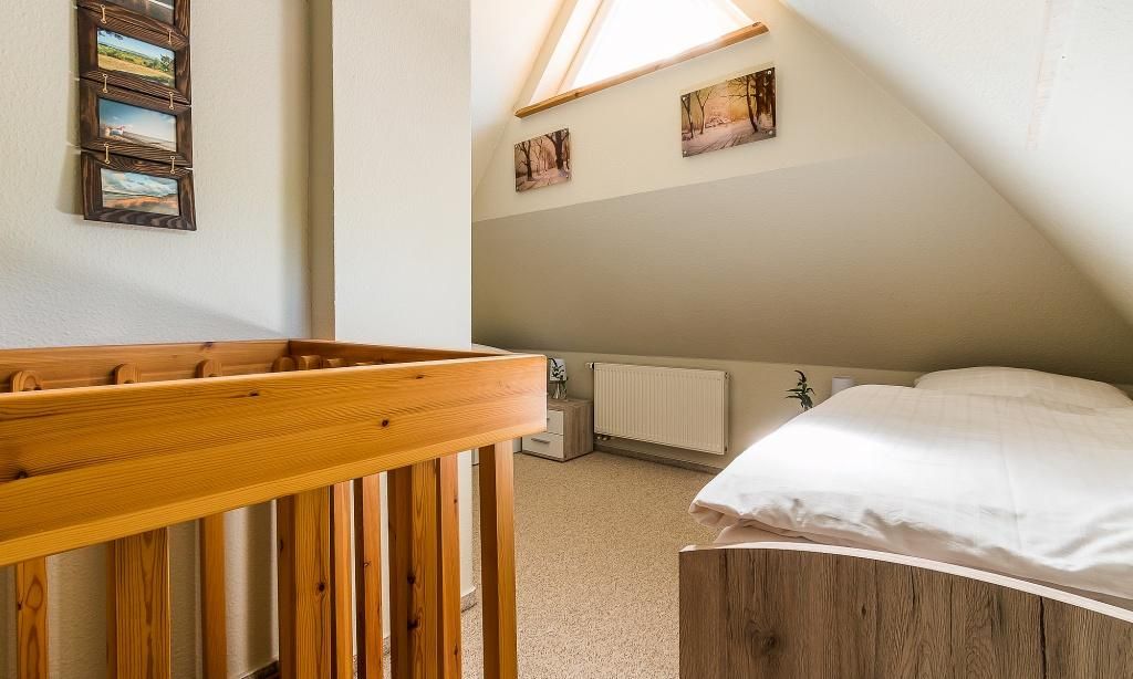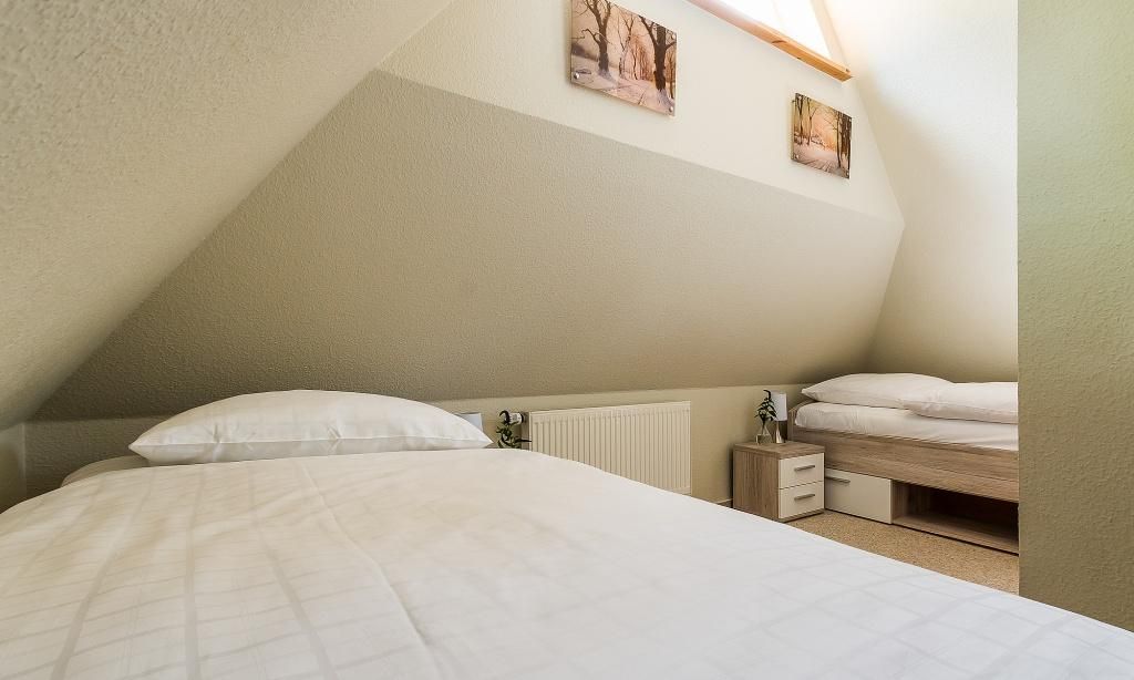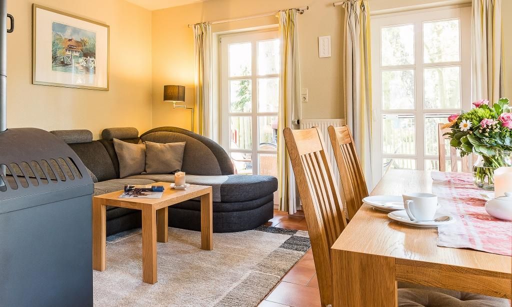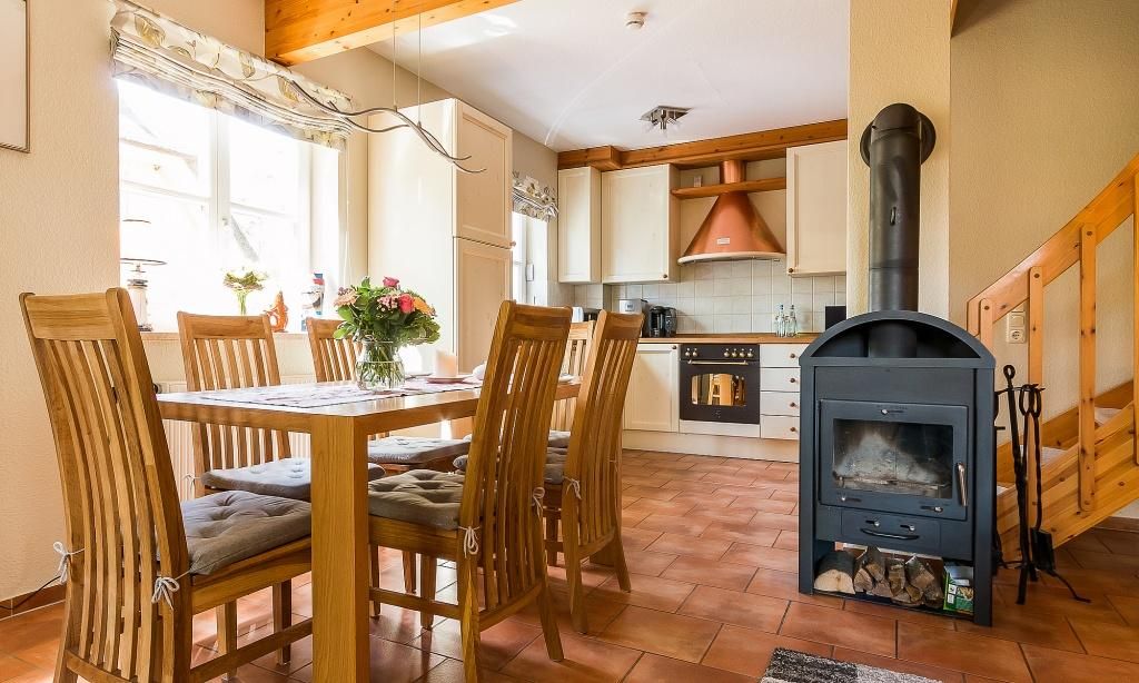 Das Erdgeschoss verfügt über einen Wohnraum mit einer gemütlichen Sitzecke am Kaminofen. Die Küchenzeile mit angrenzendem Essbereich ist direkt in den Wohnbereich integriert und schafft einen offenen Wohncharakter. Ein Bad mit Dusche/WC findet ebenfalls im Erdgeschoss Platz. Im Obergeschoss befinden sich zwei Schlafzimmer, die jeweils mit Doppelbetten ausgestattet sind sowie ein Bad mit Dusche/.WC. Das Dachgeschoss ist zu einer offenen Schlafgalerie ausgebaut und bietet den Gästen eine zusätzliche Schlafmöglichkeit mit zwei Einzelbetten.