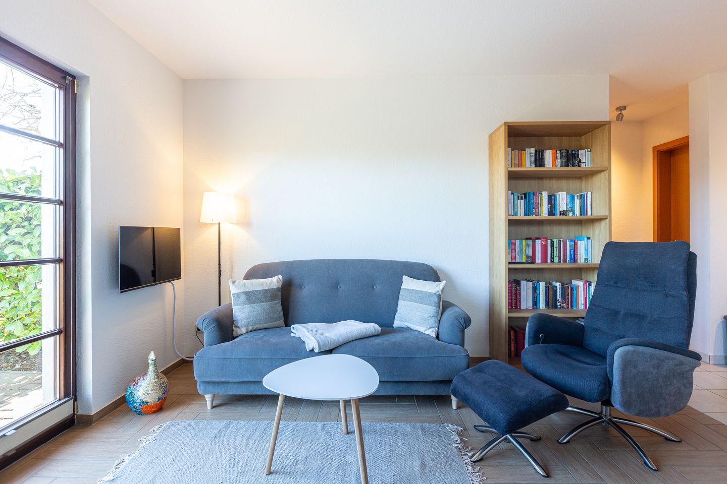 Offen gestaltet präsentiert sich der Wohnbereich mit einer gemütlichen Sitzecke mit TV, einem hellen Essplatz sowie einem Bücherregal, das für eine wohnliche Atmosphäre sorgt. Die Küche ist funktional integriert und bietet alles für den täglichen Bedarf.