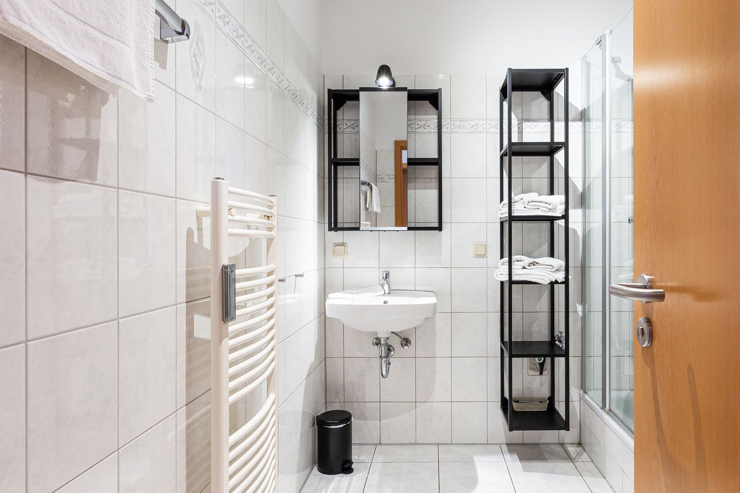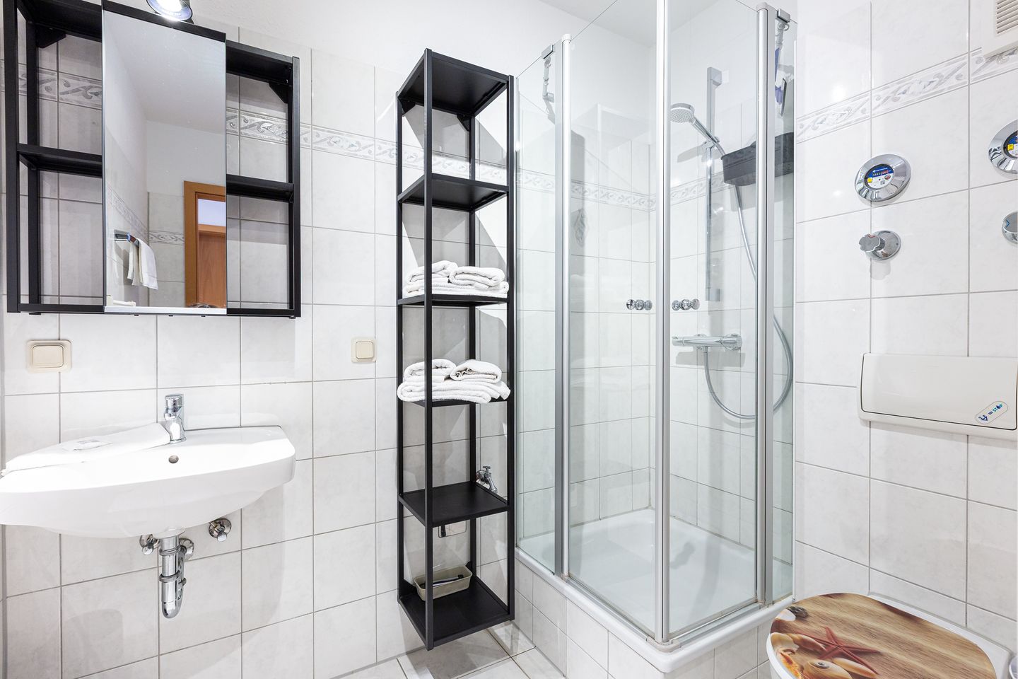 Die Erdgeschosswohnung befindet sich auf einer Ebene und ist innerhalb der Räume stufenfrei gestaltet. Das Badezimmer verfügt über eine Dusche mit Duschwanne.