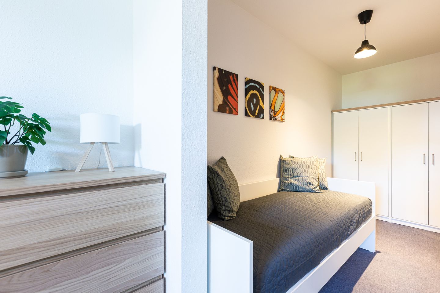 Angrenzend befindet sich ein separates, gemütliches Schlafzimmer. In einer offenen Nische stehen ein Kleiderschrank sowie eine zusätzliche Schlafmöglichkeit für eine dritte Person zur Verfügung. Das Badezimmer ist mit Dusche und WC ausgestattet.