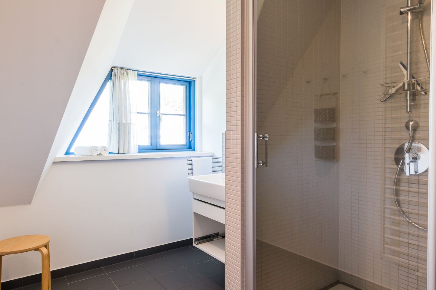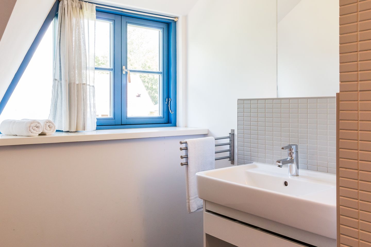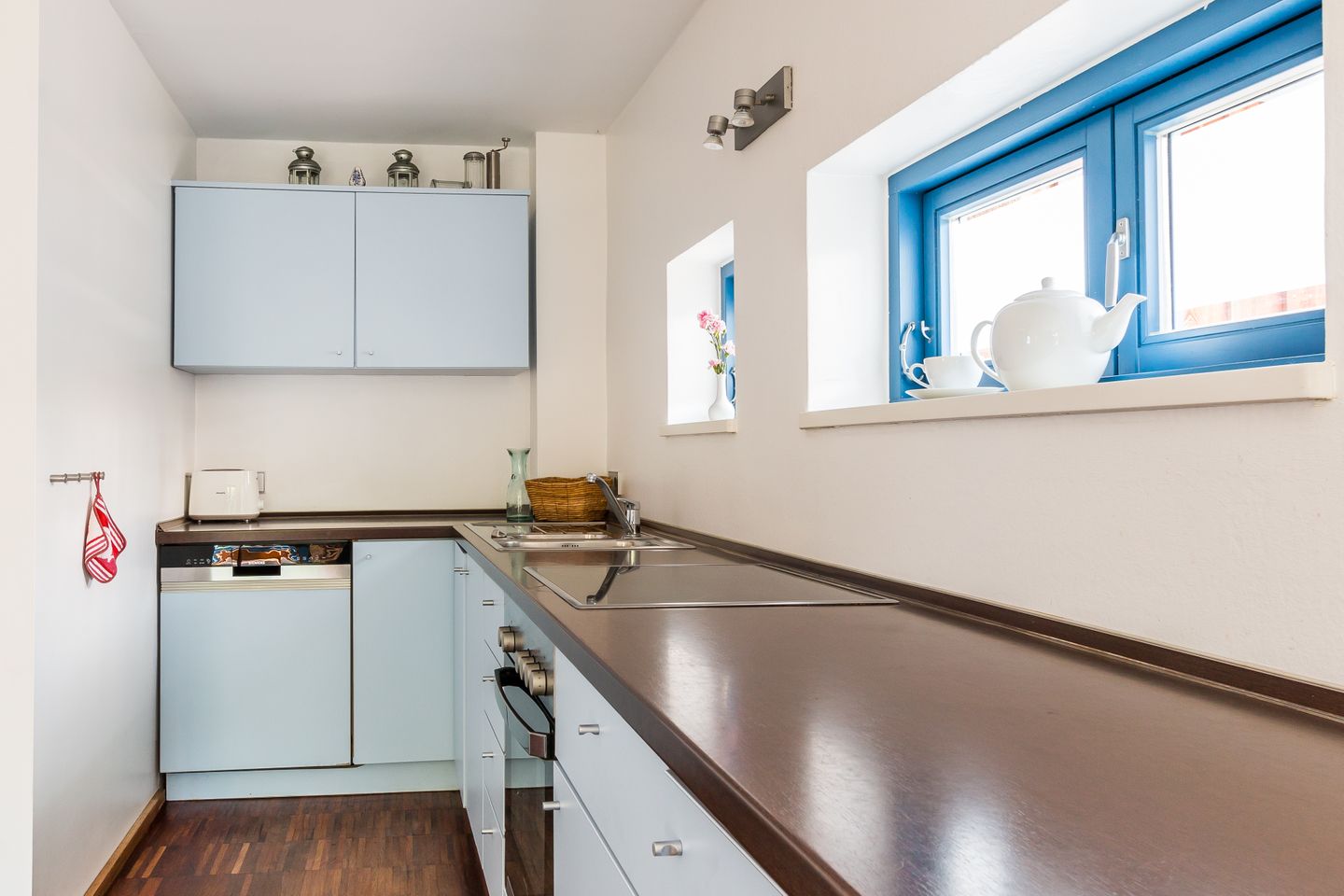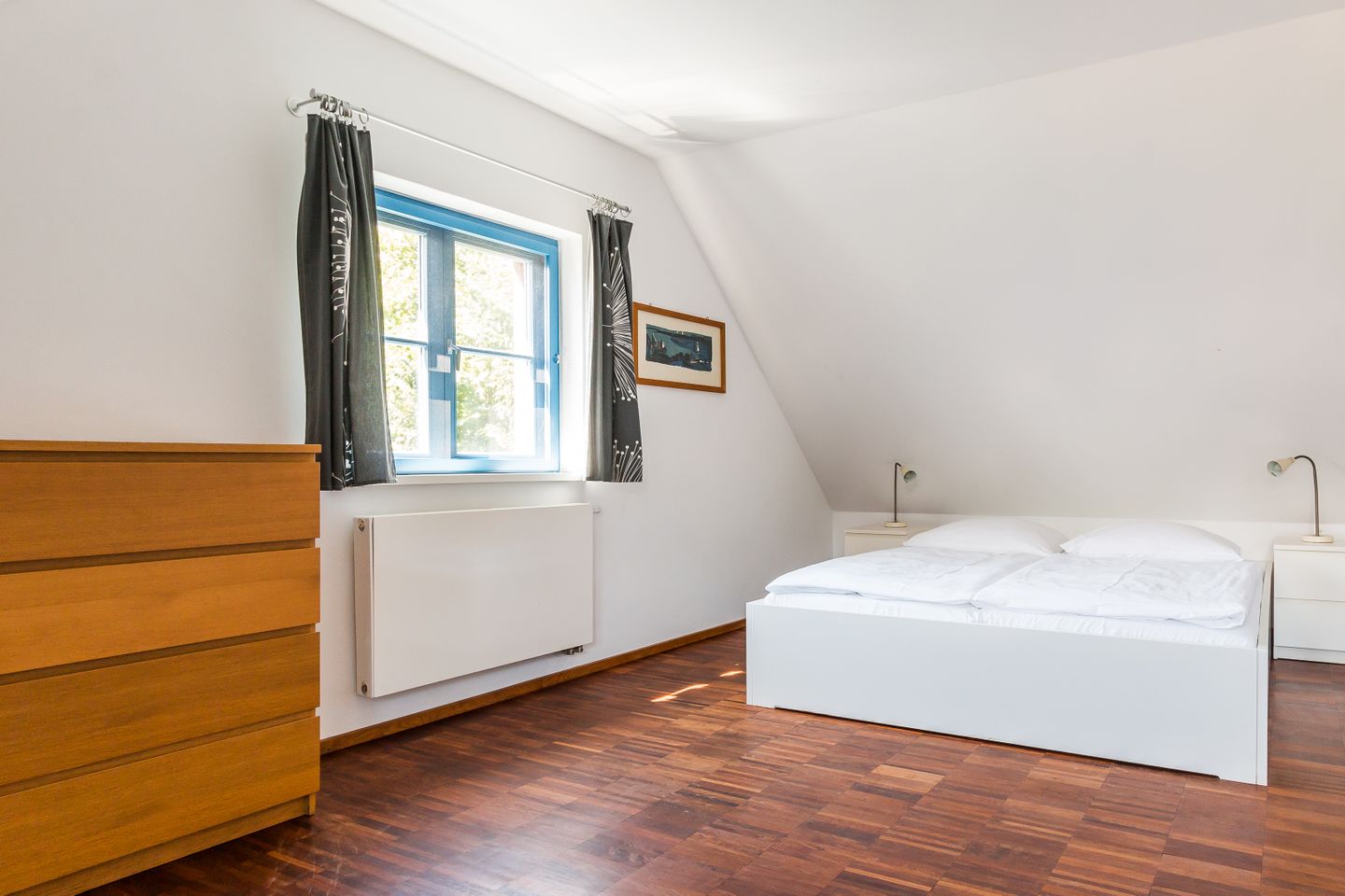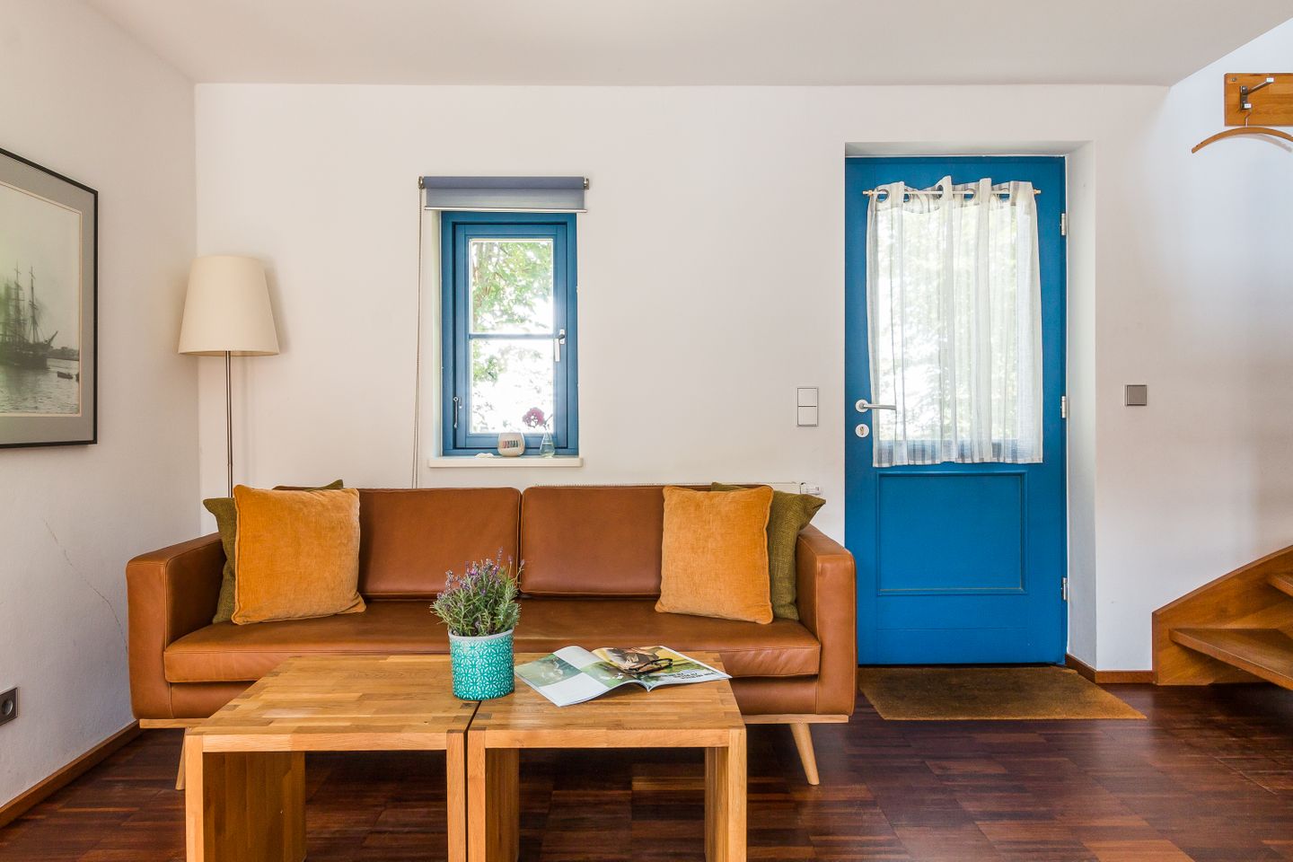 Das Erdgeschoss verfügt über einen einladenden und lichtdurchfluteten Wohnraum mit einer gemütlichen Sitzecke und Ausblick auf die Terrasse. Die offene Küchenzeile mit angrenzendem Essbereich ist integriert und sorgt für einen offenen Wohncharakter. Ein Gäste-WC befindet sich ebenfalls auf der unteren Etage. Im Obergeschoss sind ein Schlafzimmer mit einem Doppelbett sowie ein zweites Schlafzimmer mit einem Einzelbett und einem ausziehbaren Kojenbett für ein bis zwei Personen untergebracht. Das großzügige Bad mit Dusche/WC im Obergeschoss sorgt für zusätzlichen Wohnkomfort.