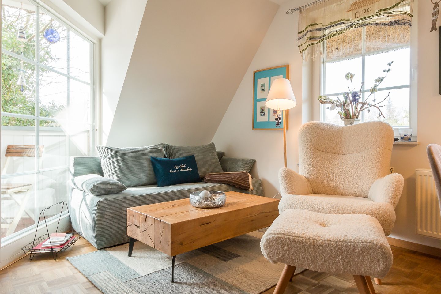 Im Obergeschoss erwartet dich der freundliche Wohnraum mit einer gemütlichen Sitzecke. Die komfortable Küchenzeile mit Essbereich ist unmittelbar integriert und sorgt für einen offenen Wohncharakter. Das Schlafzimmer verfügt über zwei Einzelbetten. Weiterhin findet ein Bad mit Dusche/WC in dieser Etage Platz. Das Dachgeschoss verfügt über ein zweites Schlafzimmer, dass mit einem Doppelbett ausgestattet ist. Der dazugehörige Balkon ist direkt vom Wohnbereich aus erreichbar.
