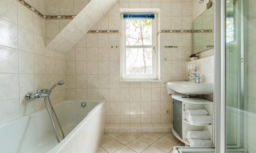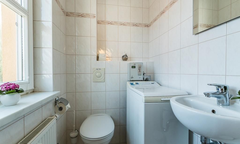 Das Badezimmer ist mit einer Badewanne sowie einer separaten Dusche ausgestattet. Zusätzlich steht dir ein angrenzendes separates WC mit Waschmaschine zur Verfügung.