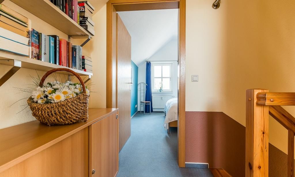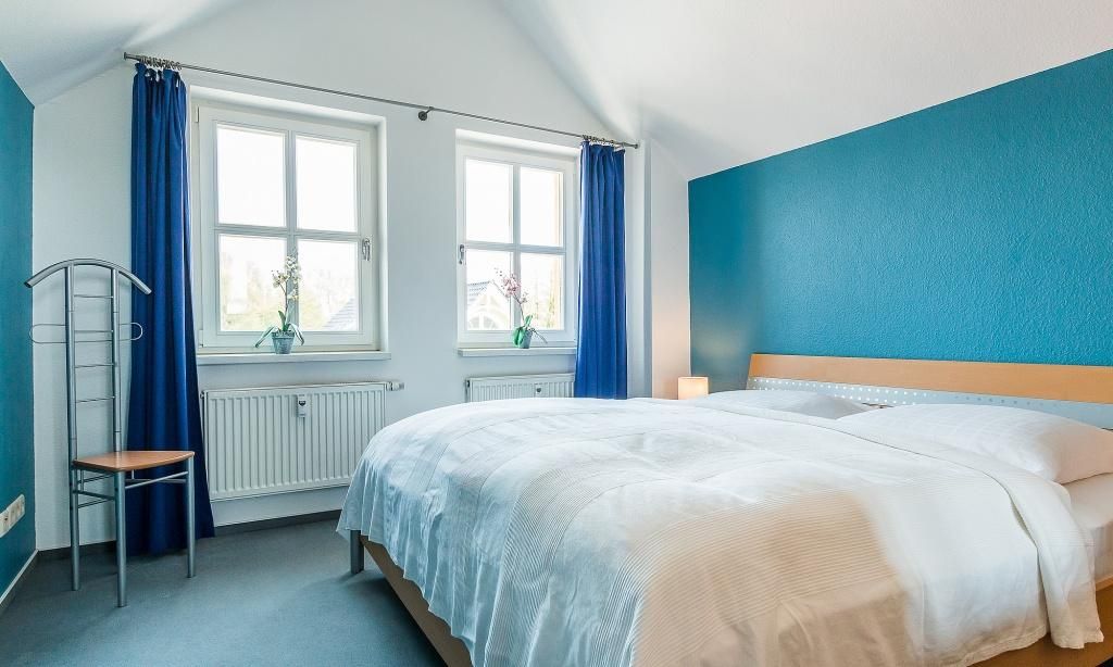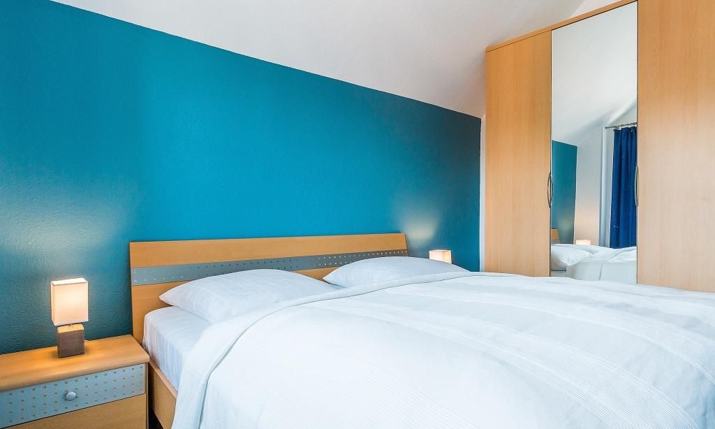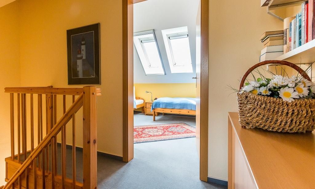 Über eine Treppe gelangt man in das Dachgeschoss, wo sich zwei gemütliche Schlafzimmer befinden, die jeweils mit einem komfortablen Doppelbett ausgestattet sind. Beide Schlafzimmer verfügen über praktische Einbauschränke und bieten dadurch viel Stauraum für deine persönlichen Dinge.