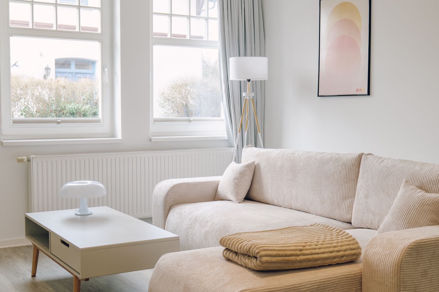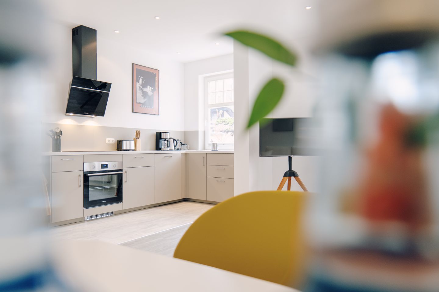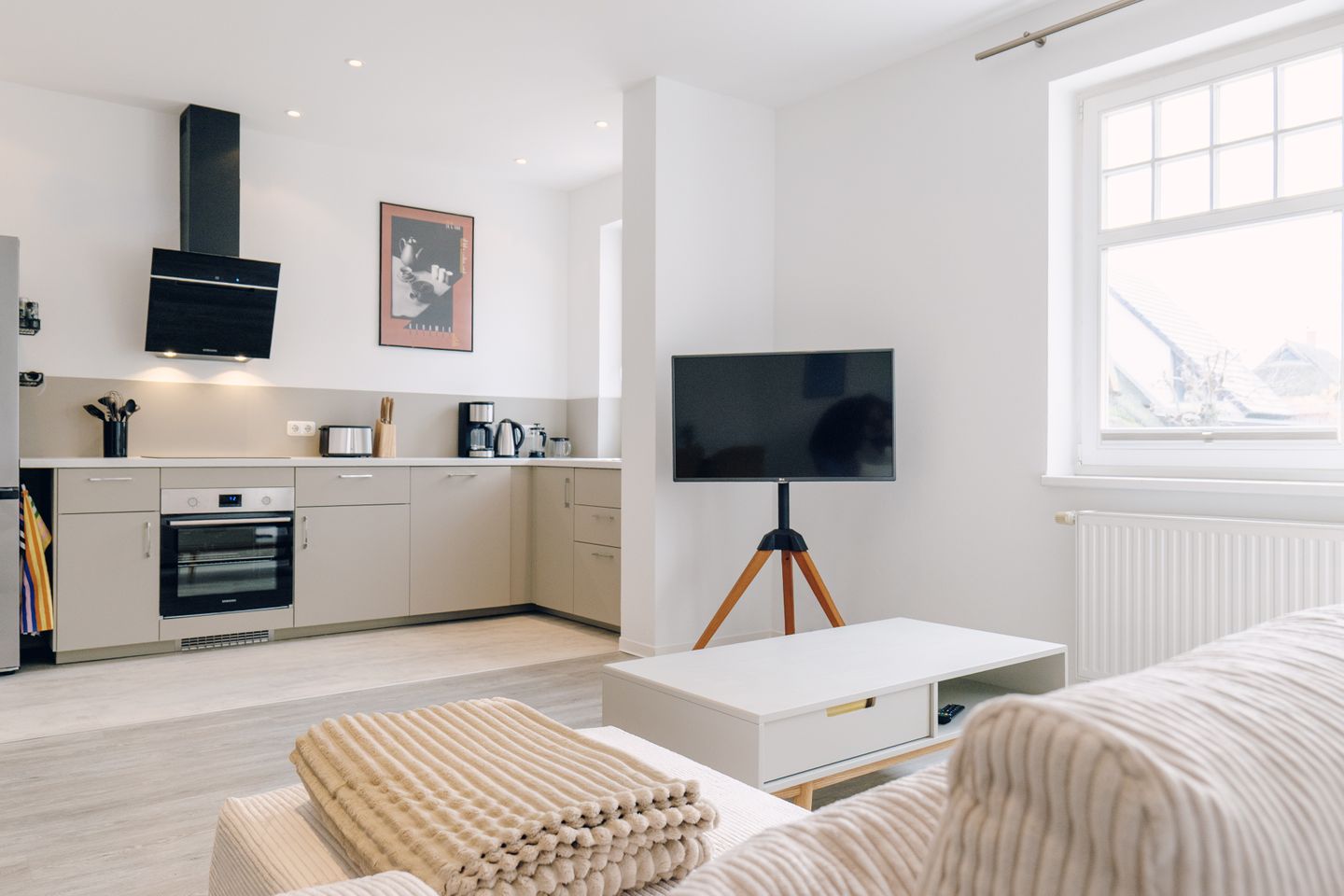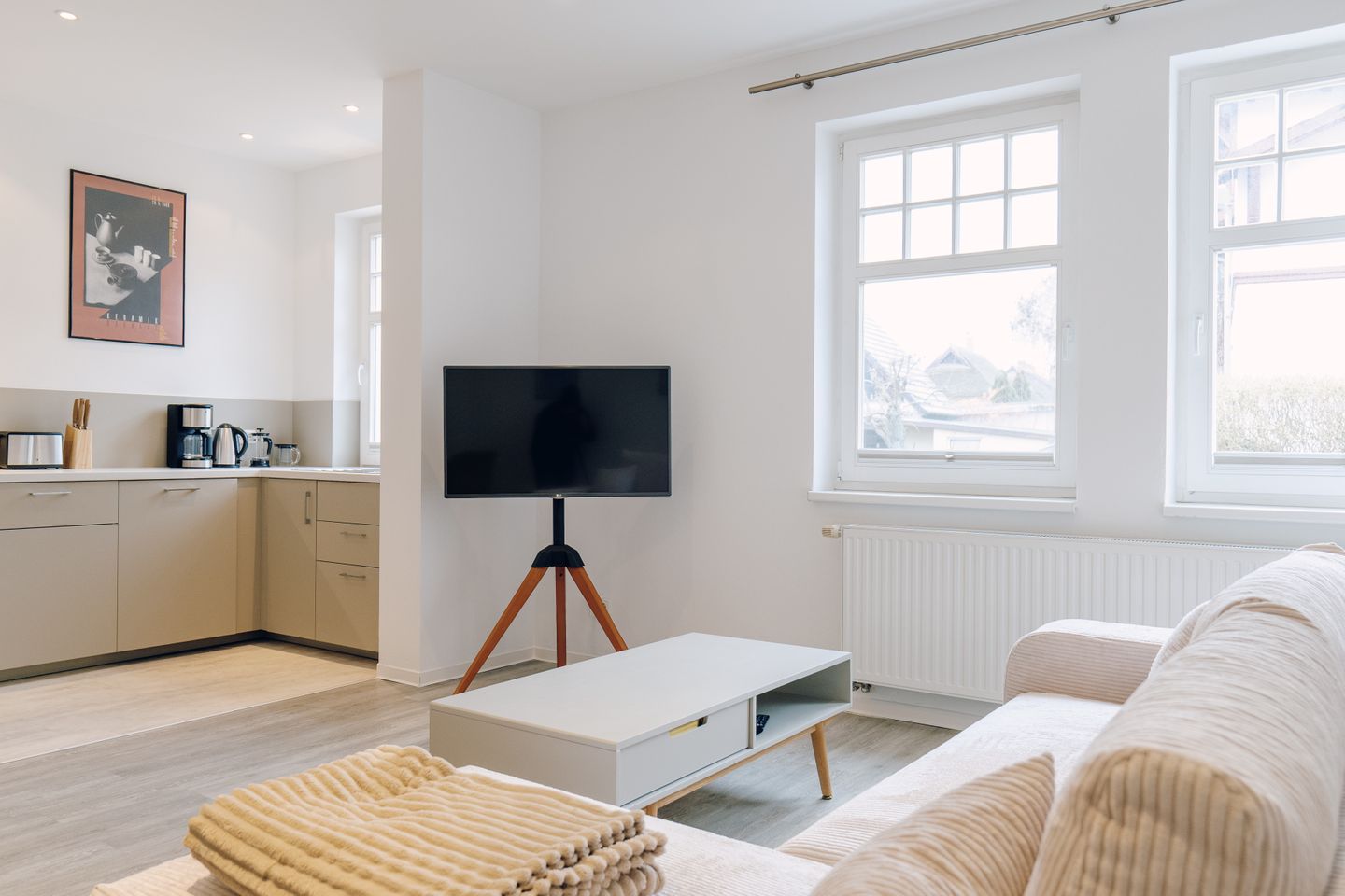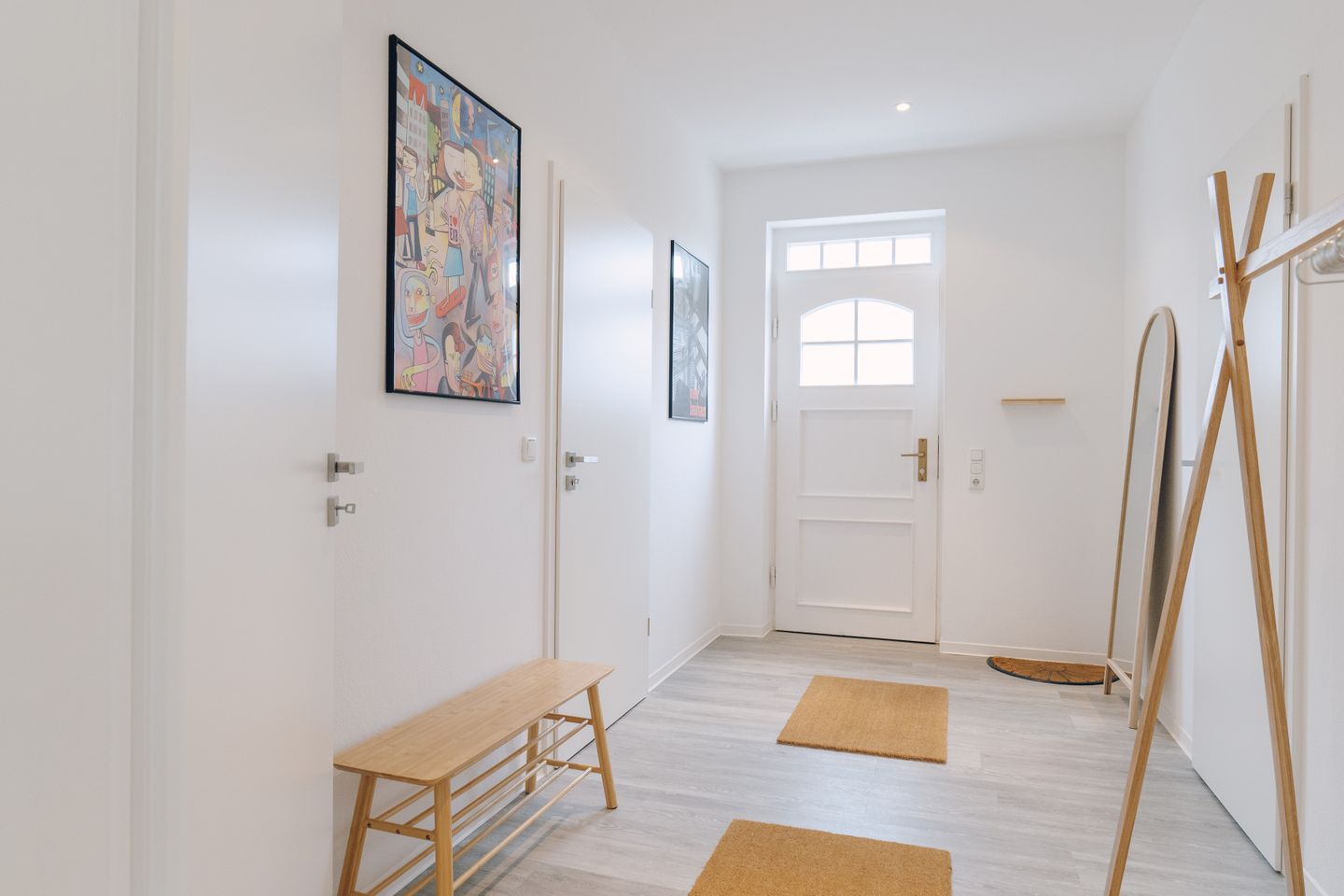 Die Ferienwohnung befindet sich im Erdgeschoss des Hauses mit insgesamt fünf Ferienwohnungen. Sie ist modern eingerichtet und verbindet klare Linien mit charmanten Retromomenten sowie hellen, sanften Farben, die für eine besonders angenehme Wohnatmosphäre sorgen.