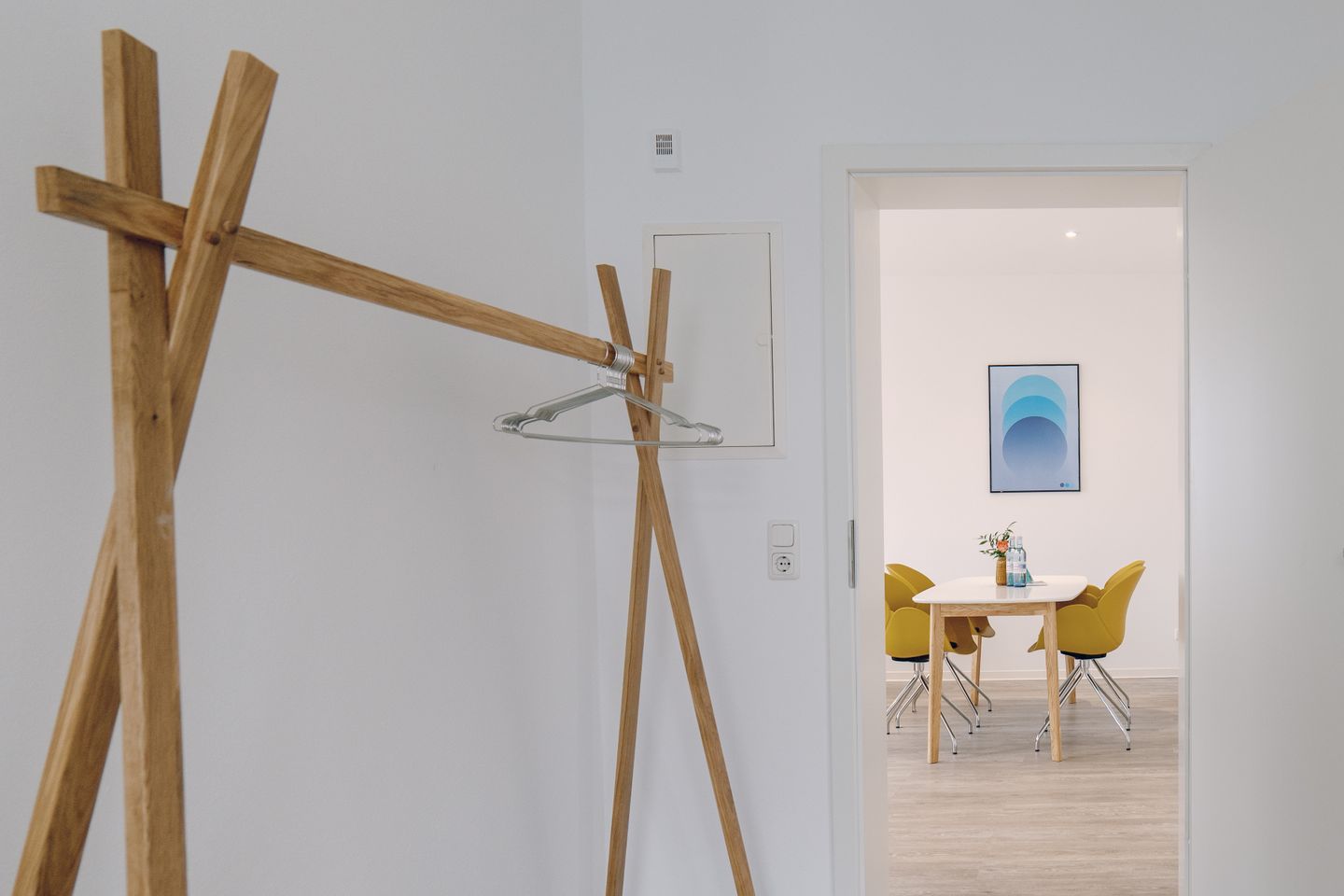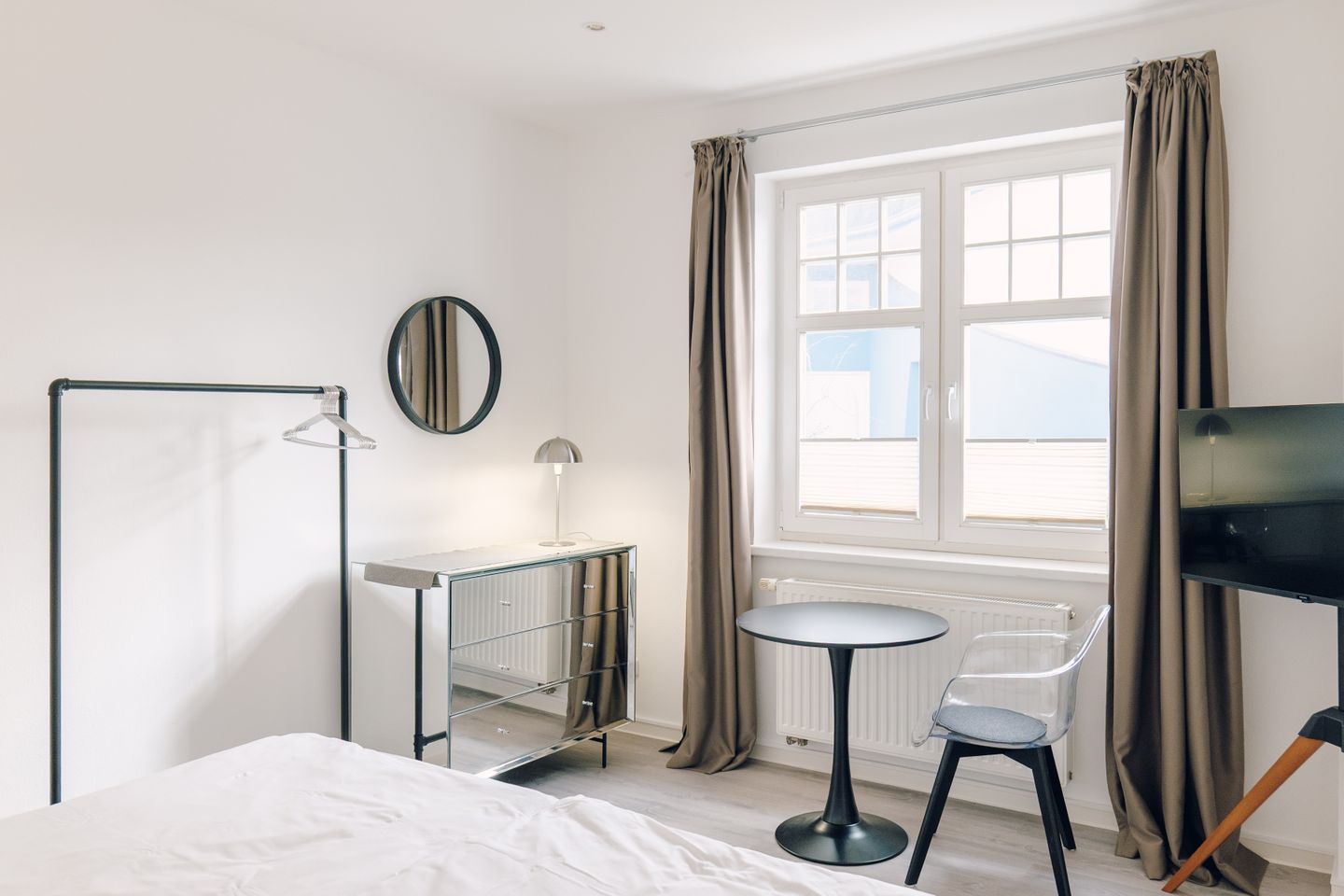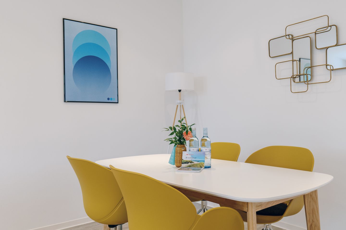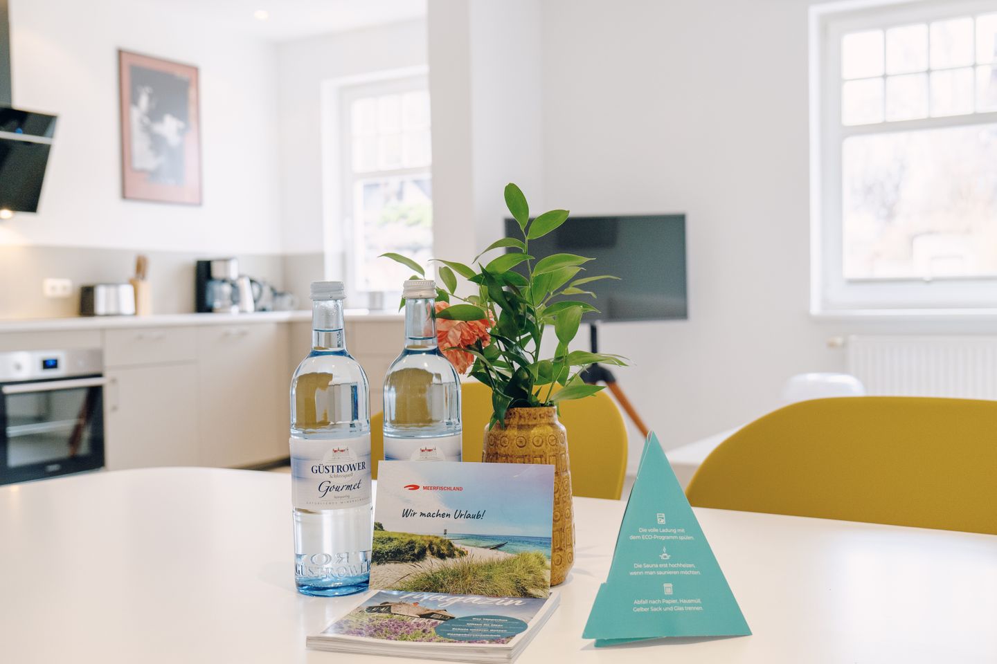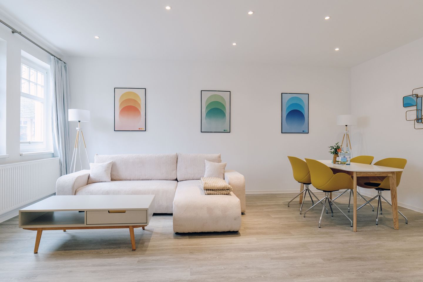 Die Ferienwohnung befindet sich im Erdgeschoss des Hauses mit insgesamt fünf Ferienwohnungen. Sie ist modern eingerichtet und verbindet klare Linien mit charmanten Retromomenten sowie hellen, sanften Farben, die für eine besonders angenehme Wohnatmosphäre sorgen.