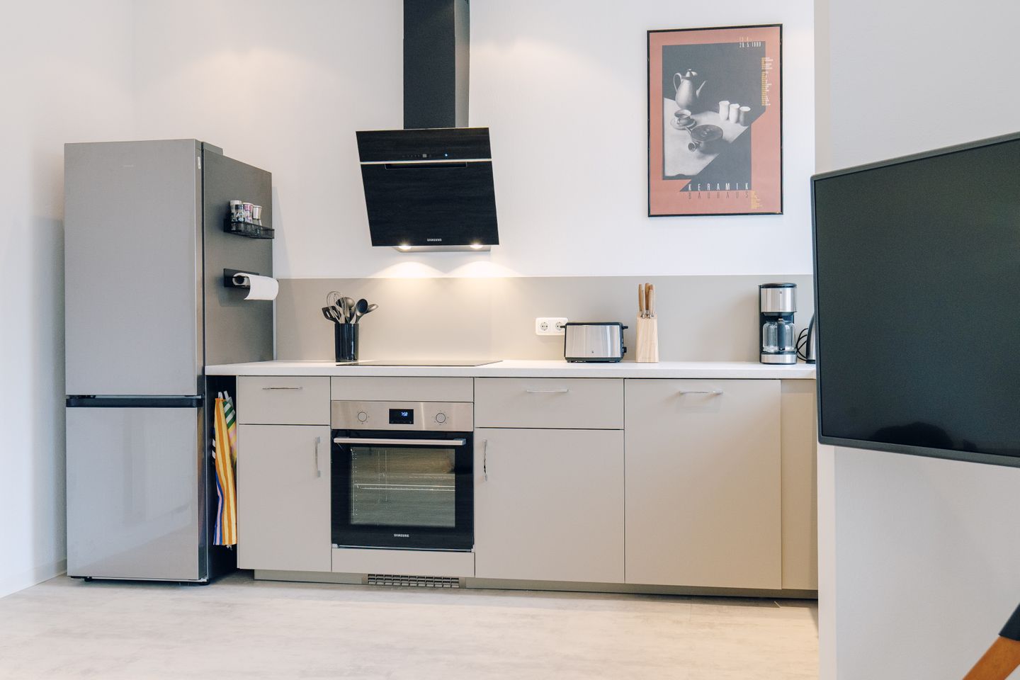 Das Herzstück der Wohnung ist der offene Wohn- und Küchenbereich. Ein gemütliches Sofa lädt zum Entspannen ein, während die gut ausgestattete Küche Lust auf gemeinsames Kochen macht. Das Schlafzimmer ist hell und zugleich sehr behaglich gestaltet und bietet mit seinem komfortablen Bett einen schönen Rückzugsort. Das Badezimmer verfügt über eine Dusche und eine Badewanne. Eine kleine Terrasse sowie ein eigener PKW-Stellplatz gehören ebenfalls zur Wohnung.